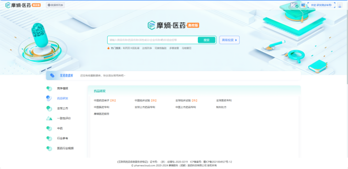 摩熵医药数据库高度集成生物医药全产业链上下游数据,经过深度清洗、整合、设计,覆盖了整个医药生命周期;通过与AI、BI和智能识别等现代信息技术结合,在海量互联网资源和大量科学文献中提取关键元数据,按照科学分类建立知识工程体系,形成专业的药学智能大数据研究系统。可为在校师生的科研、教学、产业化实践等提供多方面的服务。